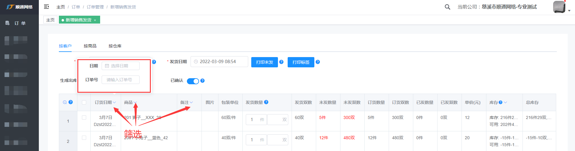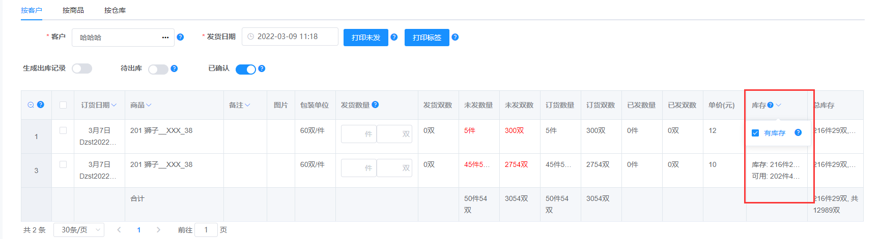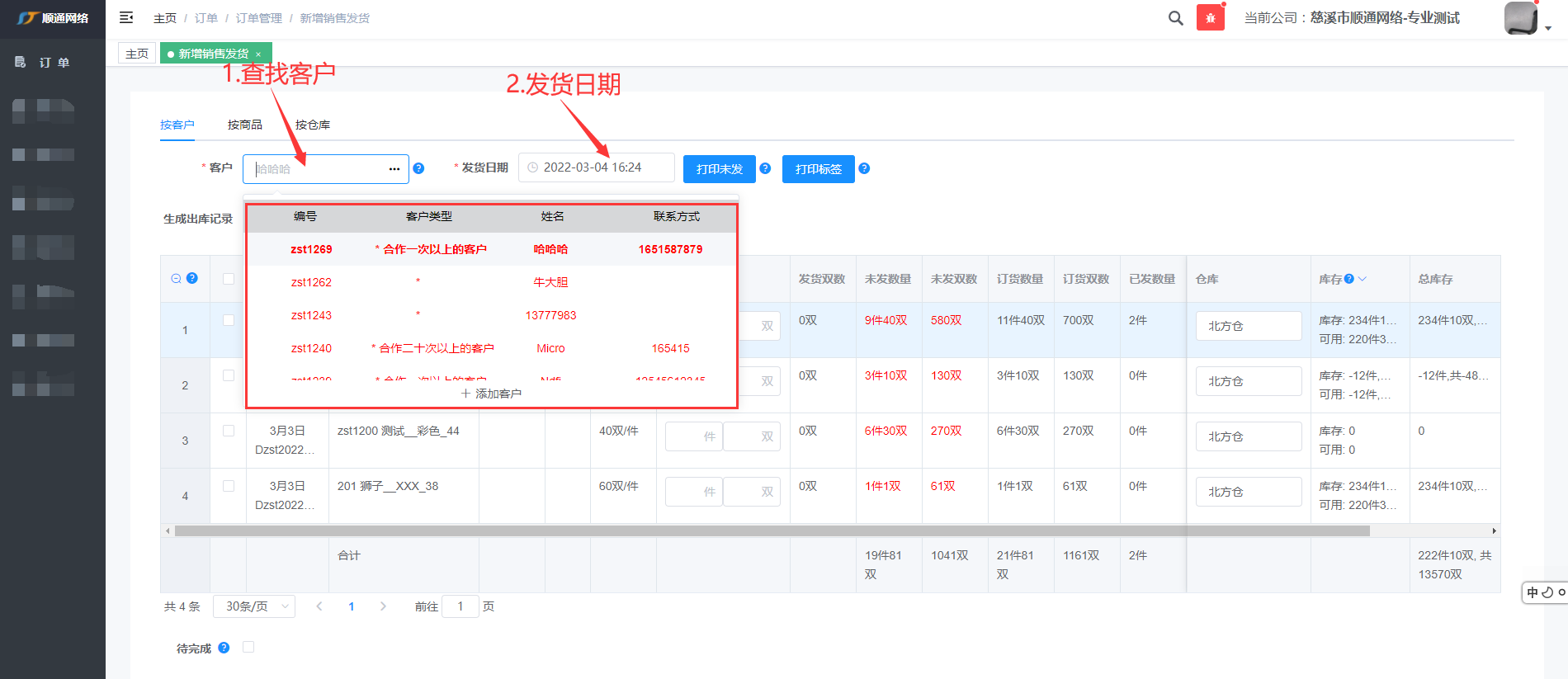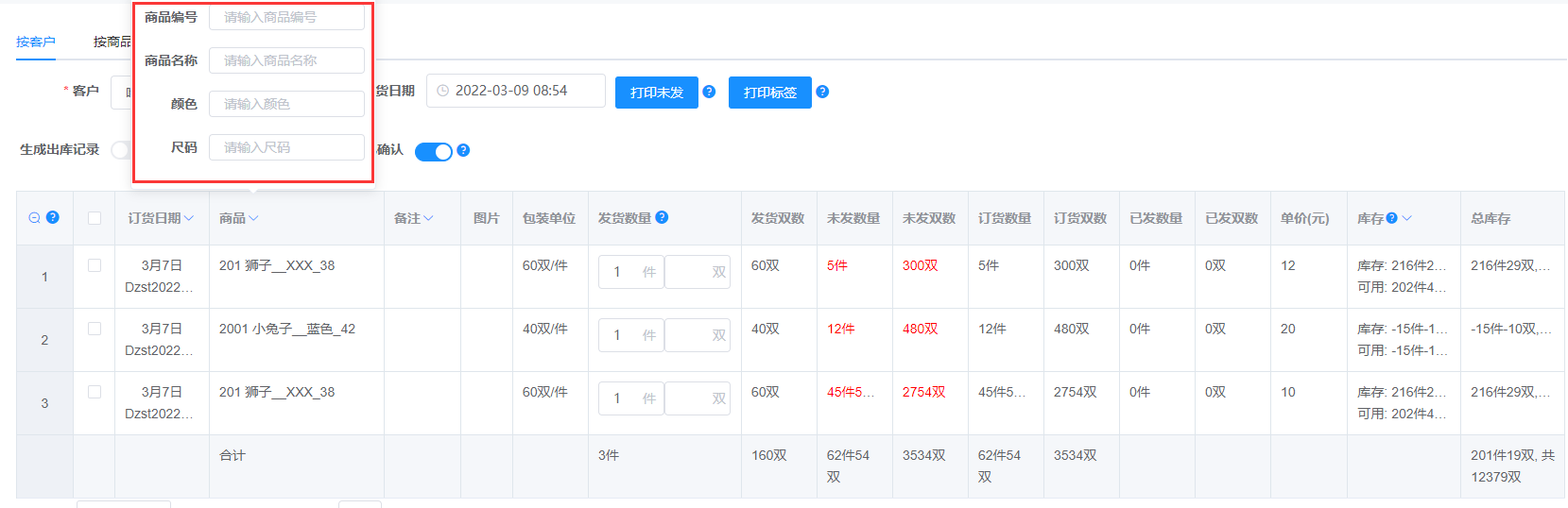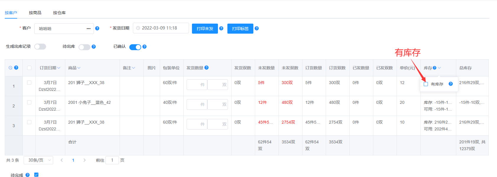 注: 输入客户编号或姓名快速查找到客户,标红表示客户有未发的货