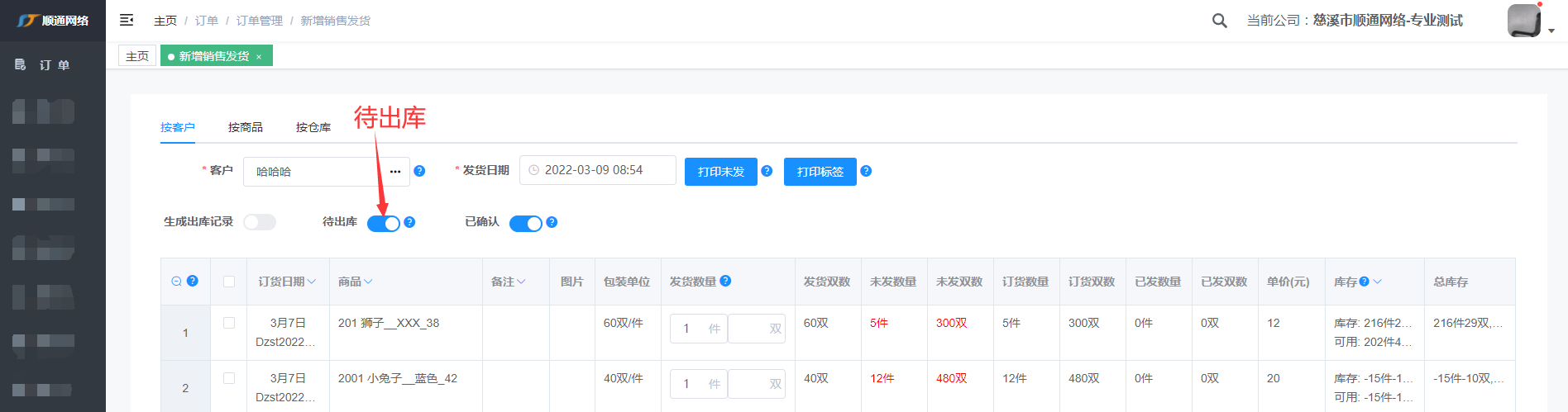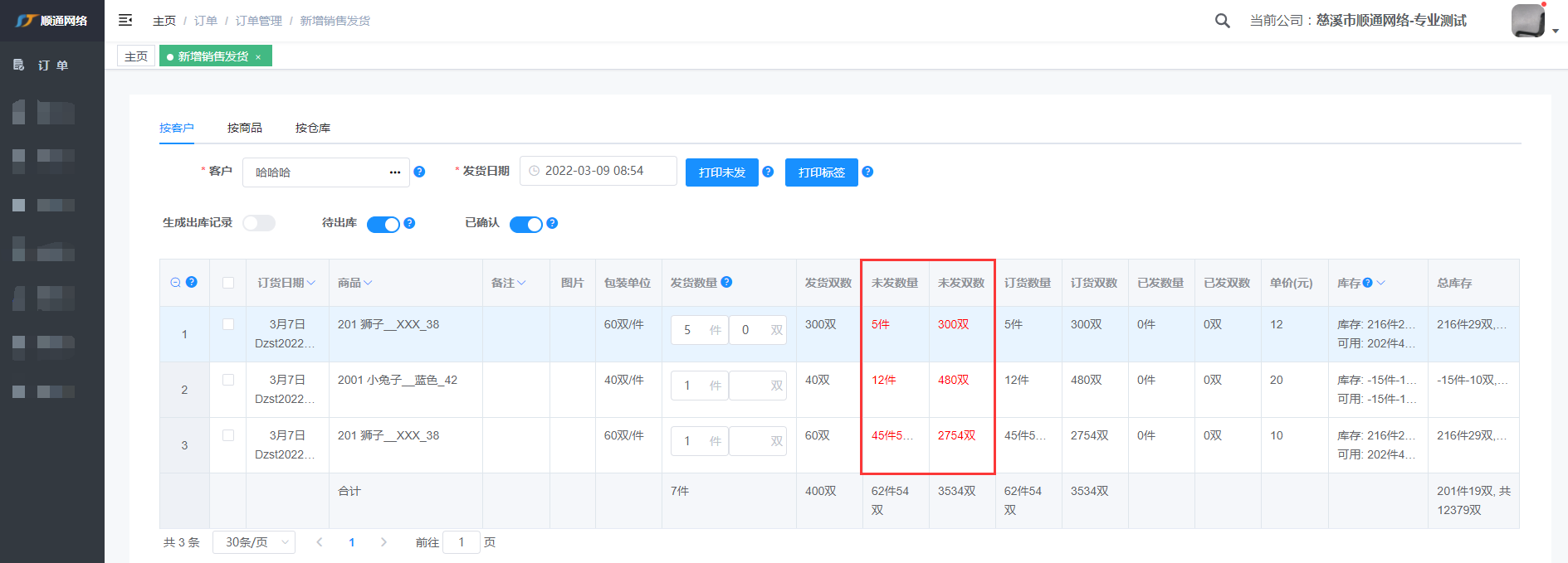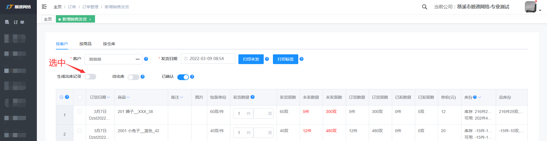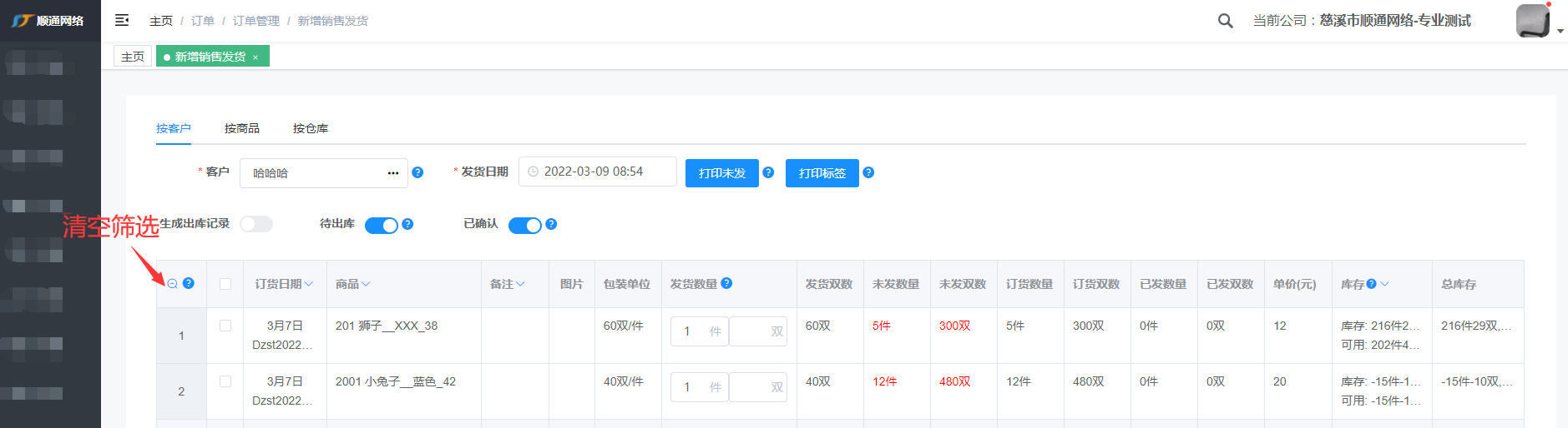 注: 输入客户编号或姓名快速查找到客户,标红表示客户有未发的货