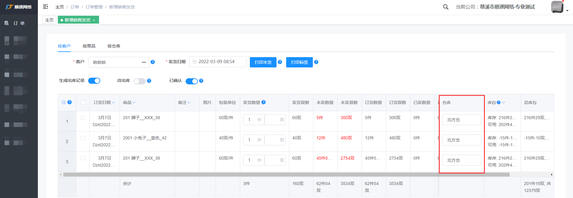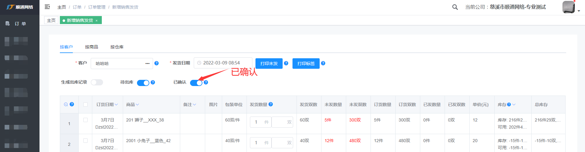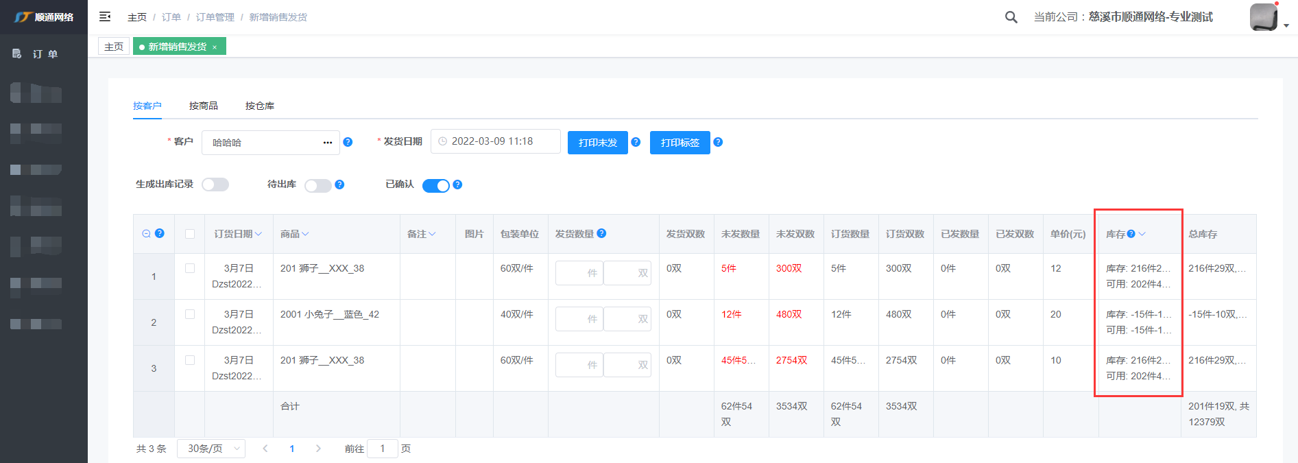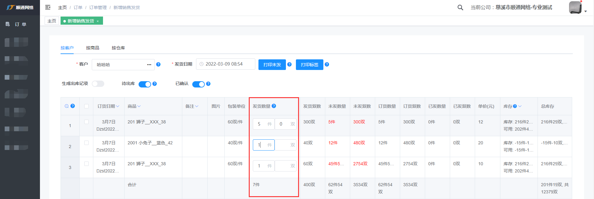 注: 输入客户编号或姓名快速查找到客户,标红表示客户有未发的货