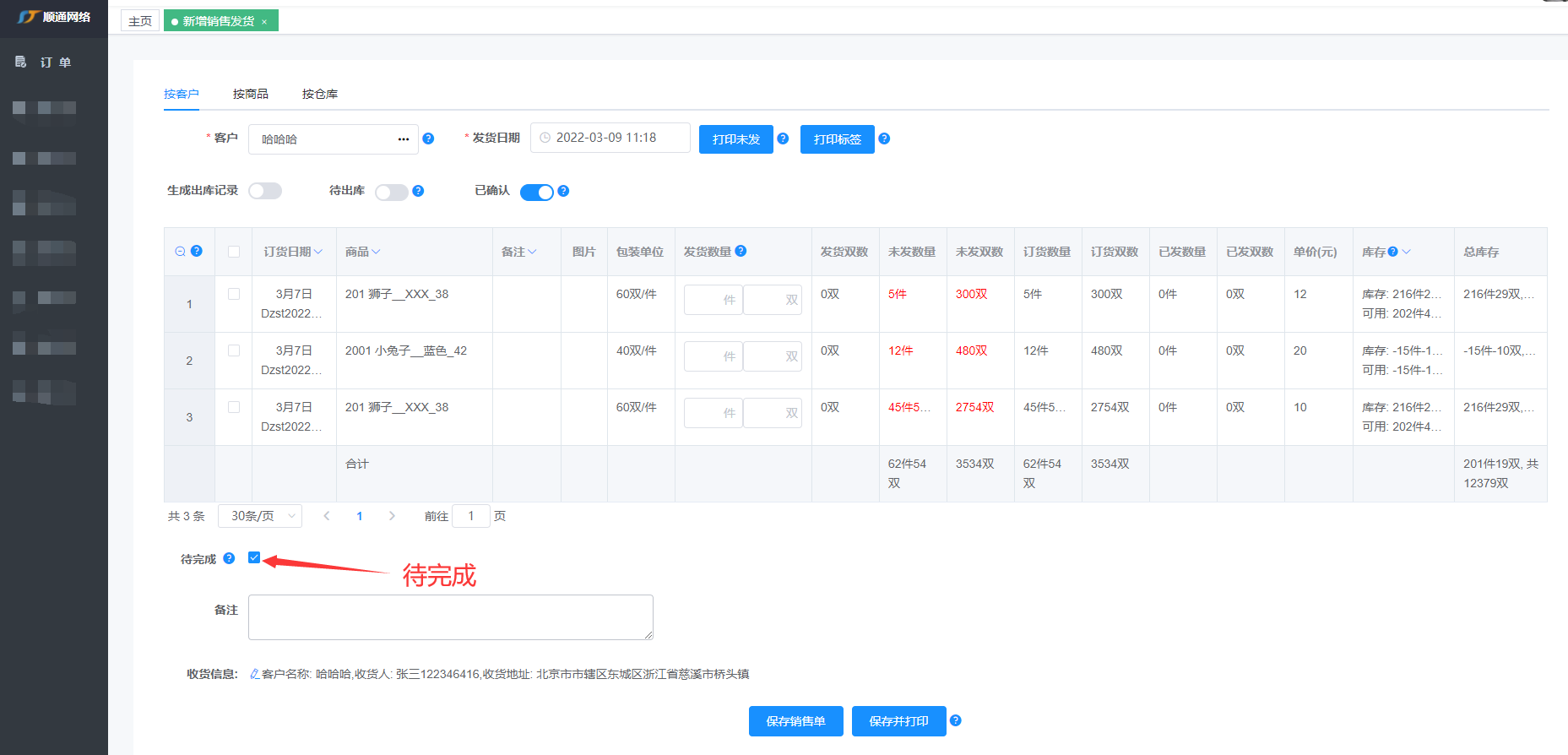 若勾选待完成,选中生成出库记录,将会生成未完成的发货单,且生成一条未完成的出库记录(无需扫码出库或扫码发货)