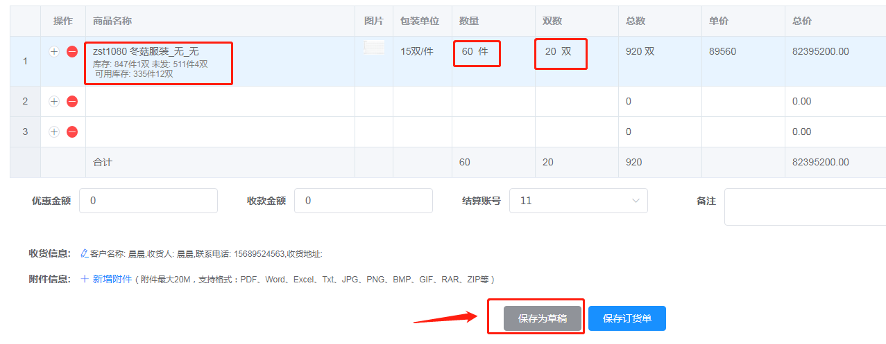 3.     选择商品的种类、数量和双数,点击保存为草稿,确定。