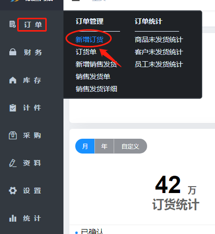 1.选择订单栏下的新增订货。