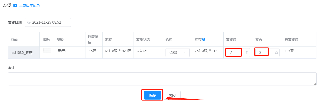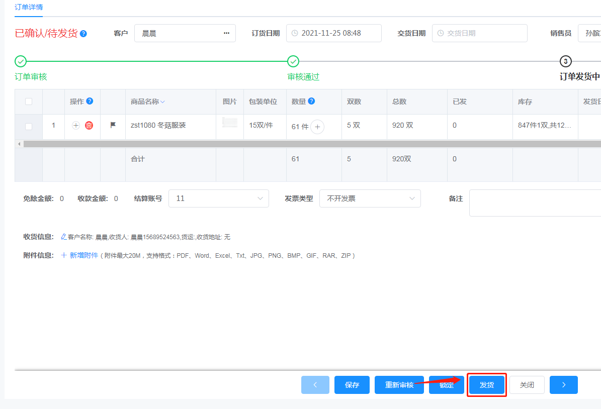 6.     在新跳出来的订货单详情中点击发货,选择发货的数量和零头,保存。