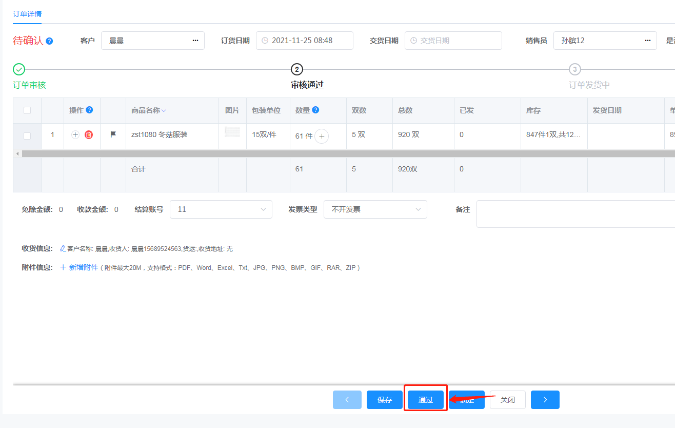 5.     在新跳出来的订货单详情中点击通过,确定。
