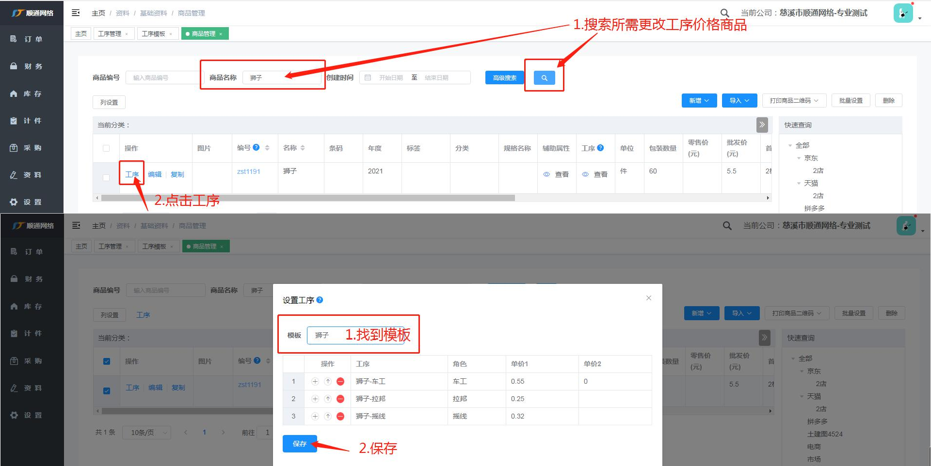 1. 搜索所需更改商品,点击工序