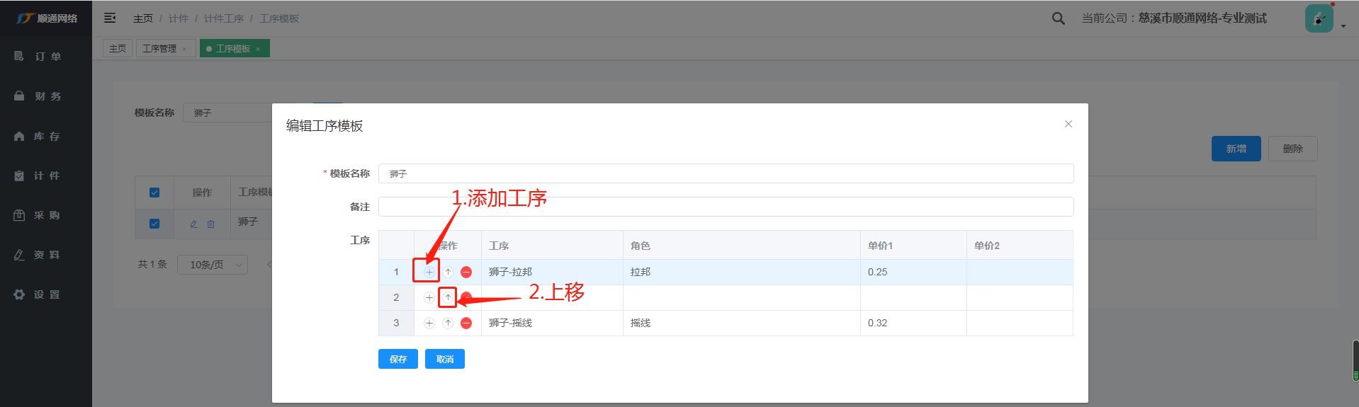 第一步:上移箭头、第二步:加号,添加工序模板、第三步:添加工序、第四步:保存