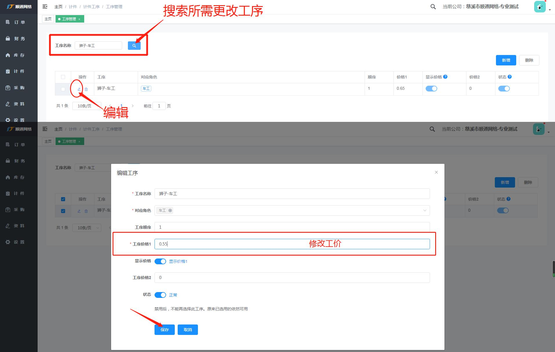 1. 搜索所需更改工序、编辑